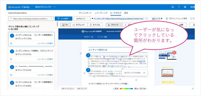 Microsoftが無料で提供しているClarityというヒートマップツールでは、クリック箇所やスクロール率などから、ユーザーが興味を示している箇所を調べることができます。CTA設置の参考にしてみてください。