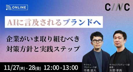 202511/27(木)12:00~13:00株式会社CINC オンラインセミナーAIに言及されるブランドへ ― 企業がいま取り組むべき対策方針と実践ステップ -