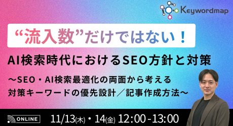 202511/13(木)12:00~13:00株式会社CINC オンラインセミナー“流入数”だけではない!AI検索時代におけるSEO方針と対策 〜SEO・AI検索最適化の両面から考える対策キーワードの優先設計/記事作成方法~ -