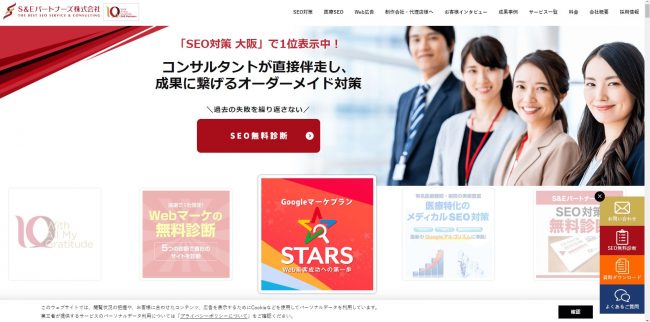 S&Eパートナーズ株式会社は、業種や予算、目標に合わせて最適なSEOプランを提案してくれる大阪のSEO対策会社です。ECや医療サイト、ローカルSEOまで幅広く対応しています。