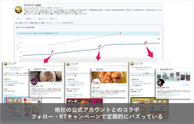 また、事前にアイドルグループとのタイアップを予告するポストも効果を発揮しています。以下図のように、その時点でシェア・拡散が起こりフォロワーが急激に増加、その後、キャンペーンが始まると、さらにフォロワー数が激増しました。