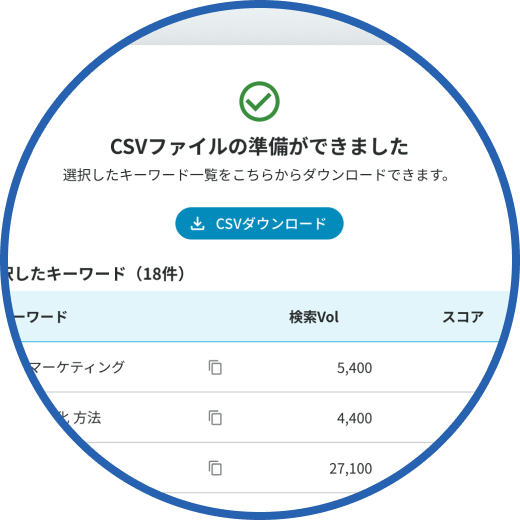 キーワードごとに、想定流入数、順位上昇に必要なコンテンツ文字数、上位表示されているページのタイトルや見出し文などをリスト化した調査レポートを即時に作成する機能です。 膨大なキーワード候補リストから、定量的且つ効率的に対策すべきキーワードの選定を行うことができます。POINT