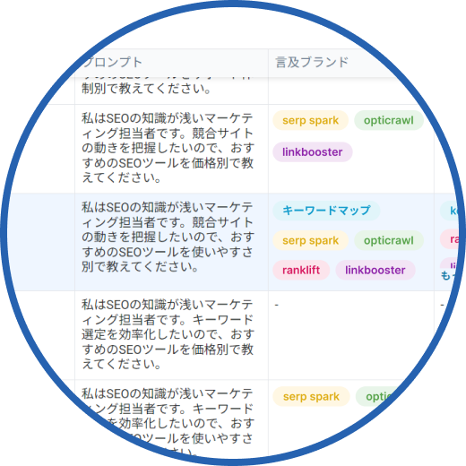 指定したキーワードにおけるAI Overviews(AIOs)の出現状況の調査、回答内容や参照元URLを抽出する機能です。 AIOsの表示・非表示を調査することで、随時最適なキーワード選定を行うことが可能です。また、AIOsの回答内容からどのようなコンテンツが求められているのか調査できるため、AIOsで参照されやすいコンテンツの制作や情報網羅性を高めて上位表示に役立てることができます。POINT